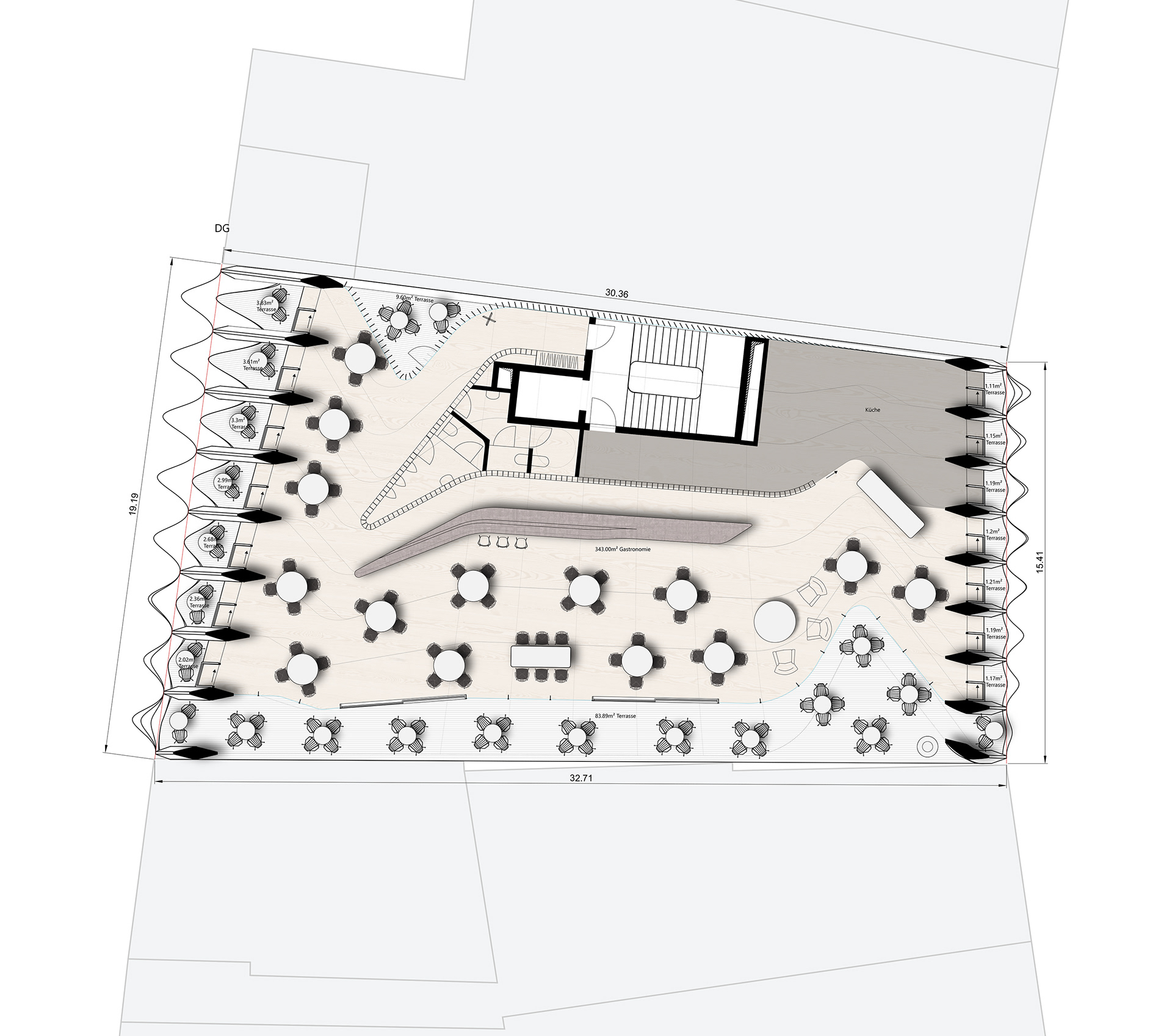 The relationship between urban space and built architecture flows through the entire building. The well-known urban space becomes a new spatial experience here. The elegance of the architecture can already be seen on the facade, whose characteristic feature in the finely balanced shape and color scheme and the use of purely natural materials such as wood, stone, concrete and glass evoke a sensual spatial experience and a feeling of happiness.