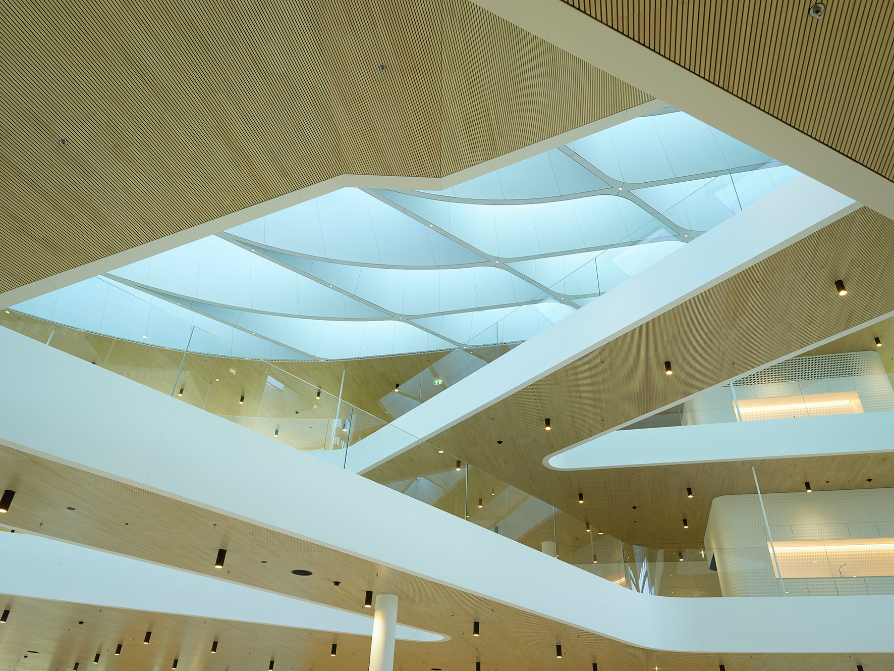 Through the use of digital technologies and state-of-the-art manufacturing techniques, the form and function of buildings can be rethought for the people who live and work in them, without exceeding the budget. For example, a digital, virtual coordinate system, with the help of which the 3D model and natural dimensions could be compared at any time, made it possible to construct the roof from approximately 780 individual parts and a staircase that becomes a sculpture. Here, design is not an end in itself, but focuses on people and their needs.